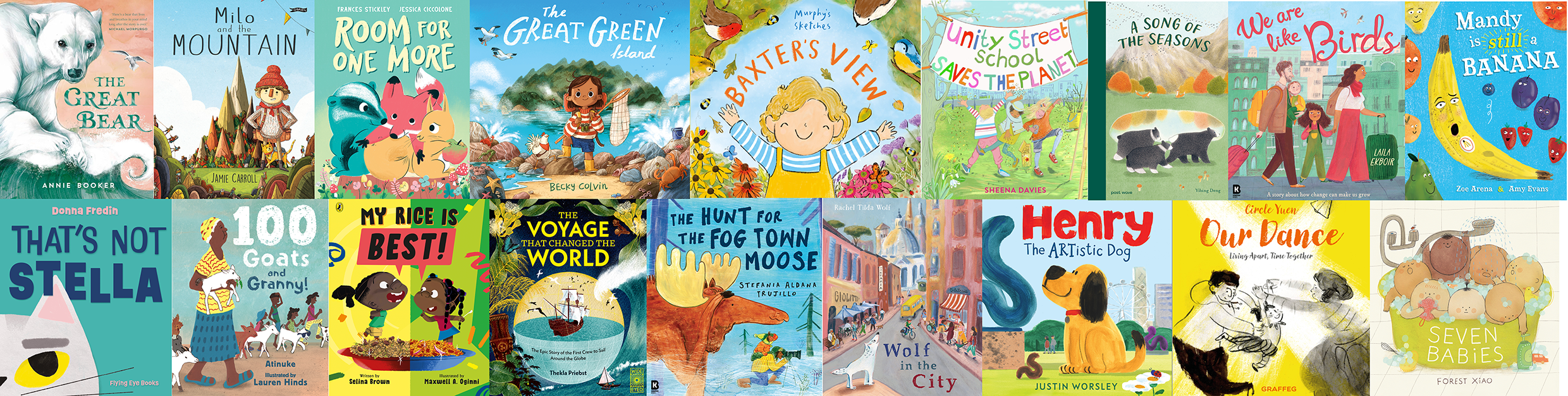 This year 18 books have made it to the longlist. Andersen Press, Kumusha and Walker Books each have two books on the list, while independent publishers Graffeg, Otter-Barry Books and Scallywag Press are also represented. Three of the four books on the Waterstones Prize Illustrated Books Shortlist are in the running: Milo and the Mountain by Jamie Carroll (O’Brien Press); The Great Green Island by Becky Colvin (Macmillan Children’s Books); and My Rice is Best, illustrated by Maxwell A. Oginni, written by Selina Brown (Puffin).
